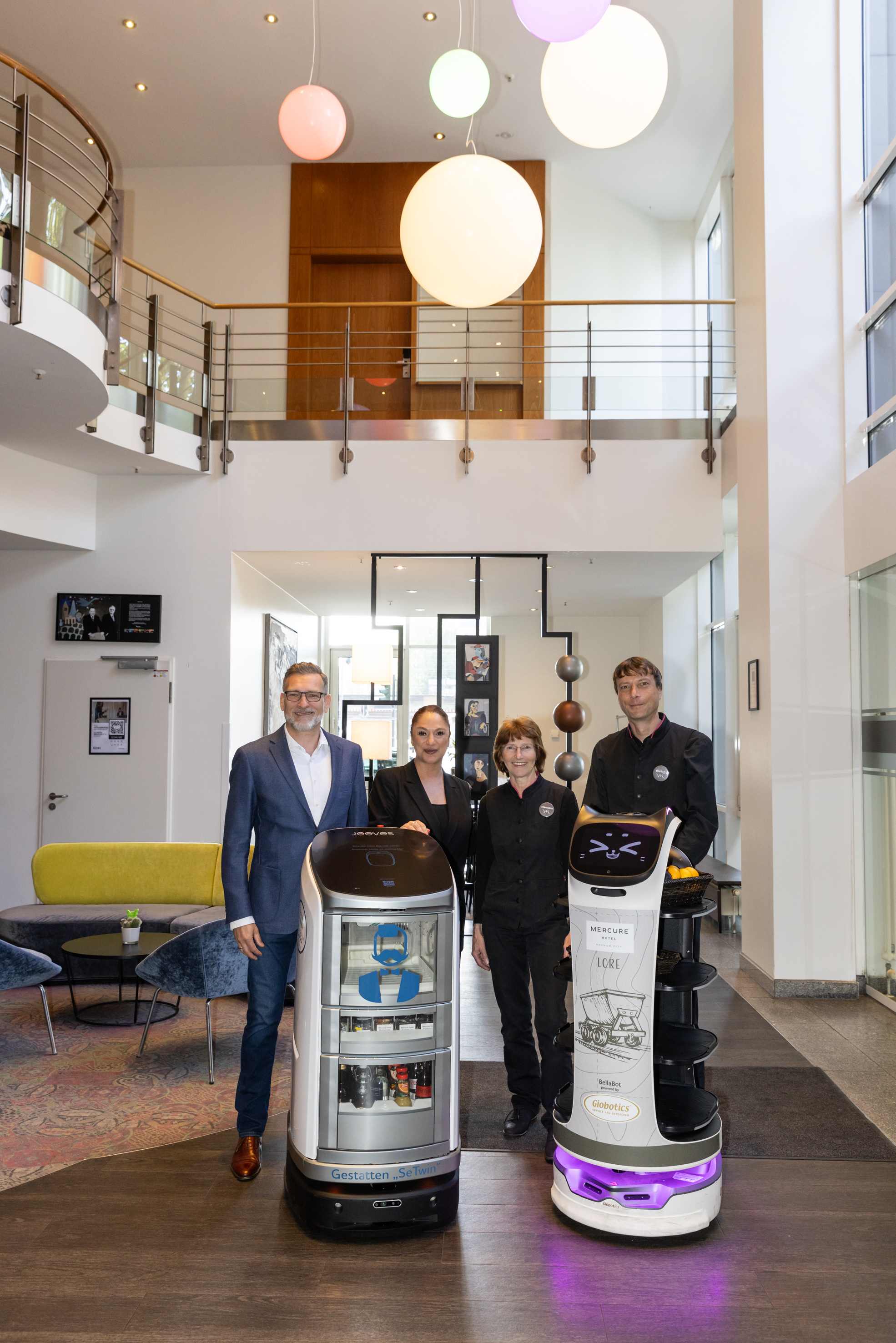 v.l.n.r.: Dennis Dehring von Giobotics, Martina Wendel und Gerald Scheurmann-Kettner von Event Hotels, André Wagner und die Roboter-Buddies vom Mercure Hotel Bochum City präsentieren ihre rollenden HelferInnen; ©Fotos: Anne Wirtz