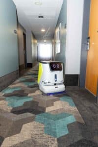 “Jeeves” nutzt autonom den Aufzug, “Jeeves” und “Lore”, “Pudu” in Aktion auf den Hotelfluren